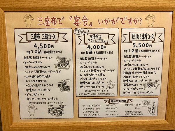 Parties are a particular feature of Japaria Mizabu. Three plans are available for a minimum of five or six people: the Japaria Mizabu, a 10 dish, two-hour plan at 4,500 per person; the Ladies and Mums plan, an 8 dish two-hour plan at 4,000 yen per person and the Niku! Niku! Manpuku Course (Meat! Meat! Stuff Yourself!), a 12 dish, two-and-a-half-hour extravaganza for 5,500 yen per person.