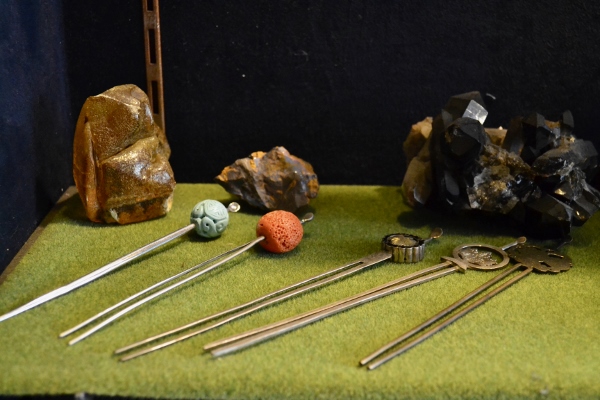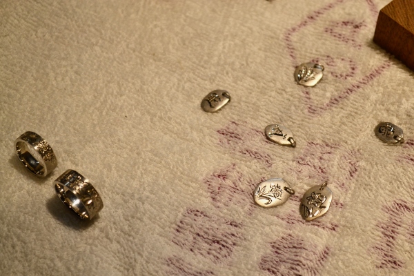 The pieces in the shop reflect this span of generations—alongside contemporary wedding rings, simple and graceful, are hairpins in traditional styles made by Akiyoshi’s parents, as well as brooches and belt pins featuring religious iconography that you’d be hard-pressed to find in your typical modern jewelry store.