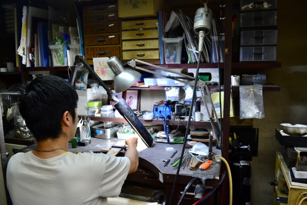 Sashou specializes not in selling jewelry, but in metalwork—a rapidly shrinking industry even in the more traditional Shitamachi area. The family not only makes original pieces, but also does repairs and takes commissions for department stores and popular theater groups such as Takarazuka. In the front of the store, there is a poster featuring a crown made for the theater group designed in the style of the Napoleonic era. From the picture of the ornate crown, it’s hard to imagine that it only took three days to make, but that attests to the artistry of the family and their dedicated work ethic.