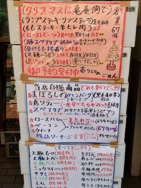 Kameya Meat Shop also offers both Christmas and New Year specials. So, if you’re in the market for some A5 Ginza-quality meat at local Kameido prices, this is the shop for you. The charming Mrs. Kameya and dapper Mr. Kameya are ready for your custom!