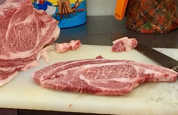 As if to emphasize this point, Mrs. Kameya hefts an enormous block of rib steak from the freezer and expertly slices off a thick cut. “Right now we have a lot of Sendai beef because it’s top quality at a good price,” she says. “At other times it will be from Chiba or Hokkaido, for example.”