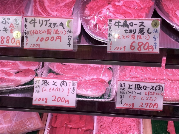 The blackboard shows the startling prices: A5 rank Sendai black-haired wagyu rib steak for 1,000 yen per 100g, rump steak at 880 yen and inner thigh also at 880 yen. This is exceptional value!
