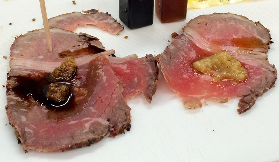 The roast beef is also strongly flavoured and cooked rare. “That’s our original sauce (“tare” in Japanese). We’ve been making it to exactly the same recipe for 67 years now,” says Mrs. Kameya. This is real roast beef, powerful and thick, liberally dosed with pungent mustard that clears the sinuses.
