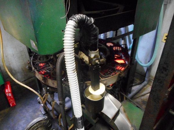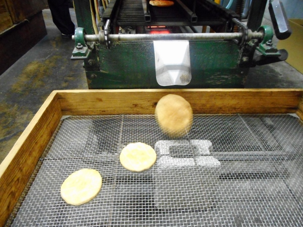 The conveyor belt takes the sembei through the baking area and onto a mesh net, where they can be checked for doneness and quality. “After this, we flavour them. It takes a while—a whole day, all told—to make a batch.”