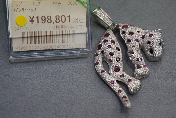 The jewellery on display comprises a wide selection of rings, earrings, pendants and brooches of varying prices, and, according to Mr. Yasuhara, as they are made of precious metals, the pieces on sale do not have to be brand goods. Looking over the showcases, I thought a pendant of a panther lying there was particularly striking.