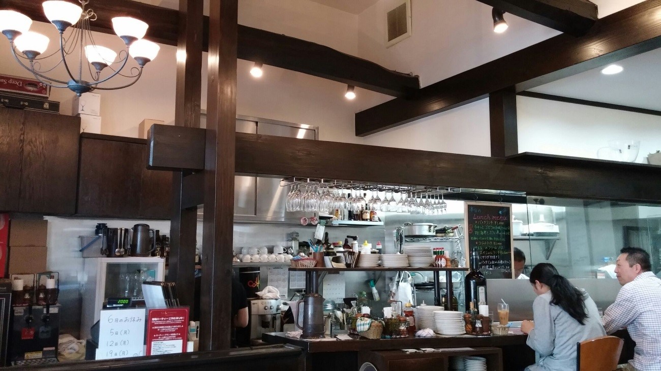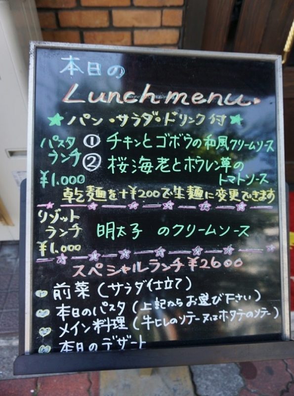 The restaurant serves a set pasta lunch menu for 1,000 yen, which, on the day I went with my wife, listed a choice of either chicken and gobo (burdock) with a Japanese-style cream sauce or sakura ebi and spinach with tomato sauce, both served with bread, salad and a drink. As an alternative to pasta, there was a mentaiko (salted cod roe) cream sauce risotto on the menu.