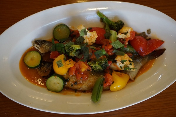 Or you can order a la carte. We were served seasonal ayu (sweet fish) meuniere which had been slowly cooked for one and a half hours and came with a selection of pan fried vegetables: shiso (beefsteak plant), broccoli, cauliflower, zucchini, paprika, peas in their pod and tomatoes. The two ayu were so tender that Mr. Ishii told us we should eat everything–heads, bones, tails, the lot, and he was right!