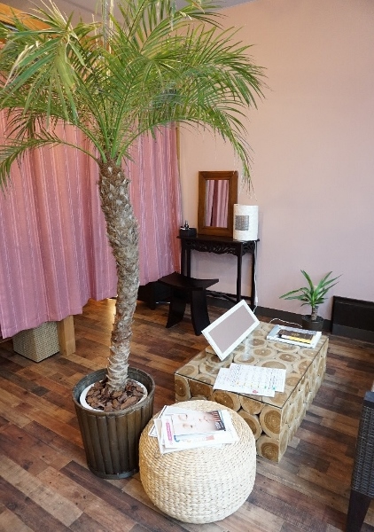 This, along with the beautiful wooden floor, dark handmade fittings, rattan settee and plants, are all designed to create an atmosphere in which her customers can sit and relax and unwind whilst waiting for Ms. Nakazawa to commence.