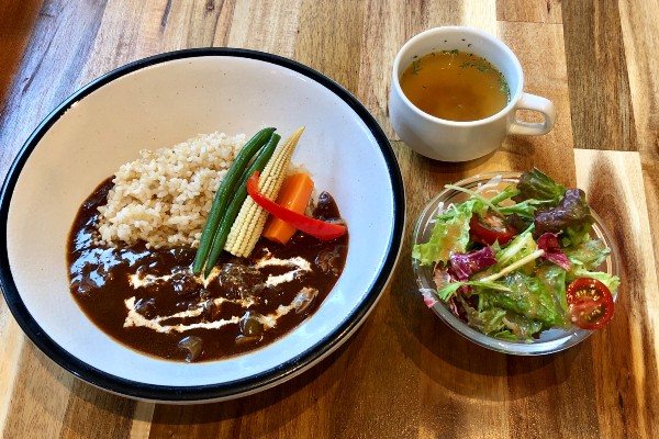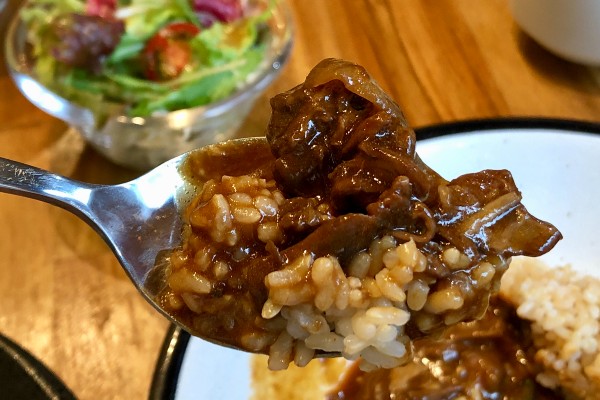 The three-beef hayashi comes with brown rice, some crisp, lightly cooked vegetables, a fresh salad and a cup of soup, all for 980 yen. The beef was slow cooked to perfection, very soft and tender, while the homemade demi-glace sauce was a marvel in itself, thick and rich. For an extra 70 yen, customers can enjoy a soft-boiled, “hot spring” egg (onsen tamago).