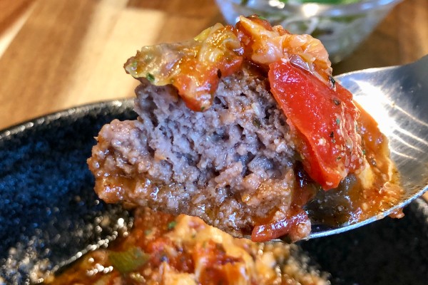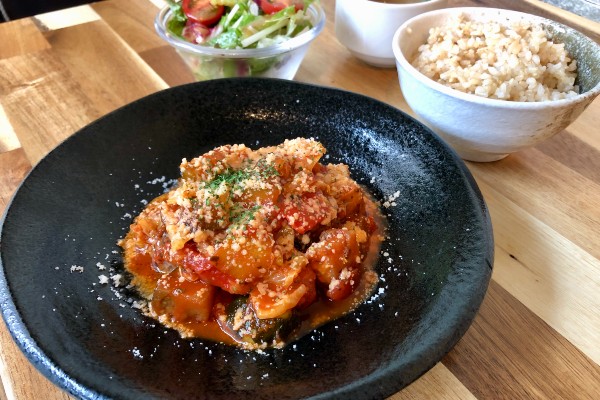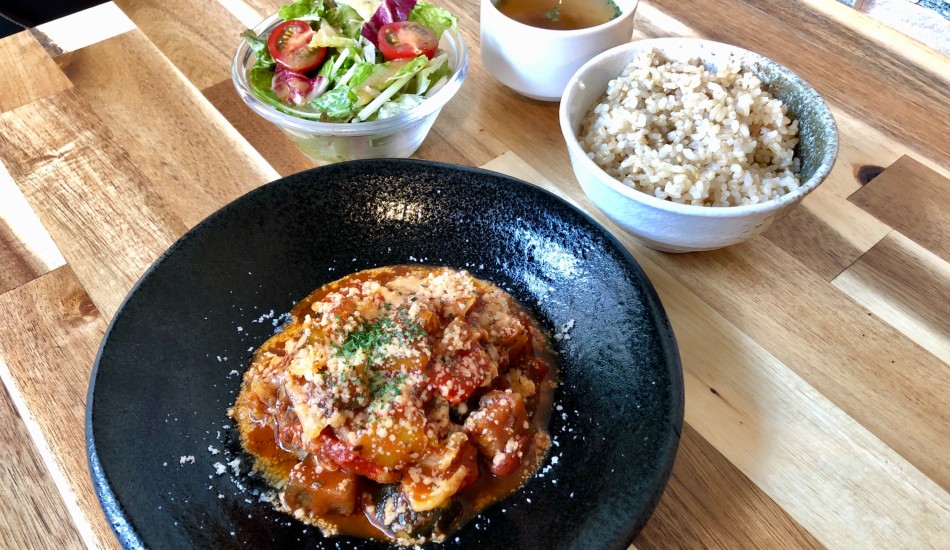 The homemade wagyu hamburg set also comes with brown rice, a salad and cup of soup. Two sauces are available, the tomato and vegetable sauce shown here or a grated daikon radish and citrusy soy sauce (oroshi ponzu). Mr. Arai’s experience in Italian cuisine was on show as the lightly spiced sauce contained fragrant, freshly chopped oregano and basil.