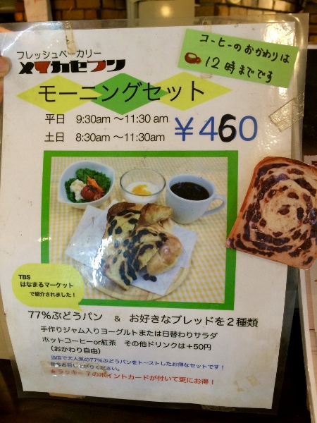 Meika Seven offers a “morning set” service, from 9:30 to 11:30 a.m. on weekdays and 8:30 to 11:30 a.m. on Saturdays. For the princely sum of 460 yen one can have the following: a slice of 77% Raisin Bread plus two other kinds of bread items, yogurt with homemade jam or salad, and tea or coffee. Other drinks can be had for a 50-yen surcharge. A free refill of tea or coffee is also available. That’s unbeatable value!