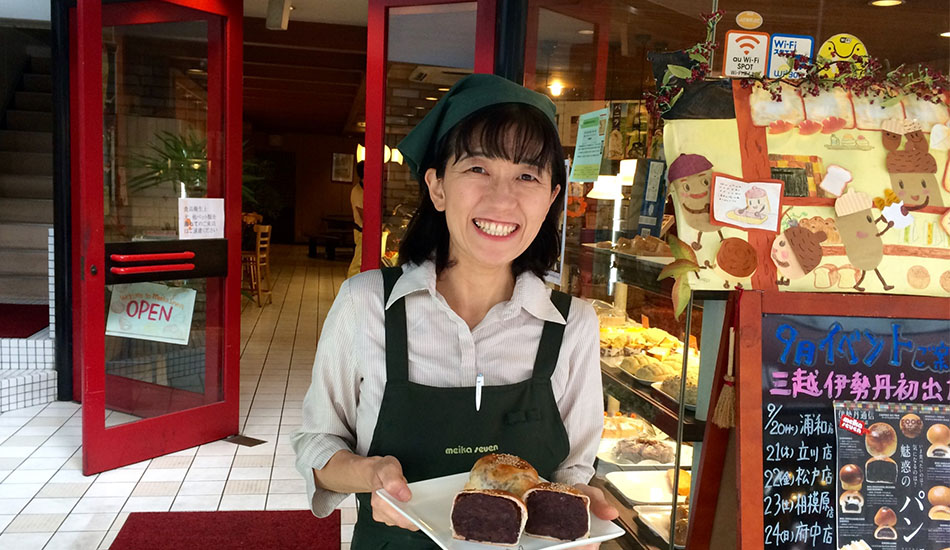 Meika Seven, the bakery and cafe on Sun Road Nakanohashi Shopping Street near Ojima station in Koto-ku, is far from an ordinary bread shop. On a recent sunny afternoon the proprietor, Mrs. Sekiguchi, took a few minutes to talk about her business, its products, and its place in the local community.