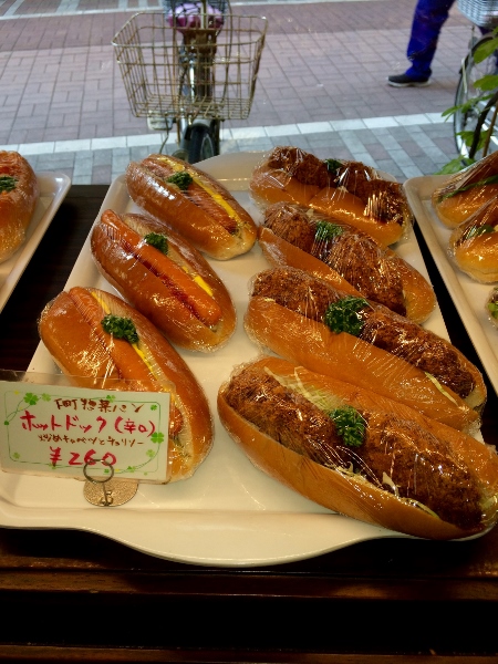 Meika Seven offers a wide variety of sandwiches and baked goods. Many traditional bakery items are on display, from these hot dogs and croquette sandwiches.