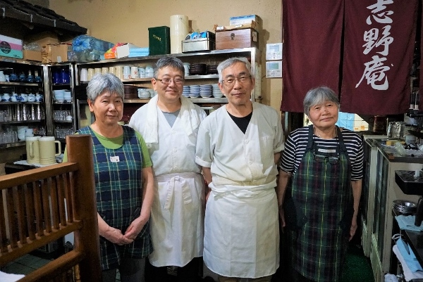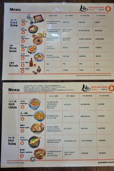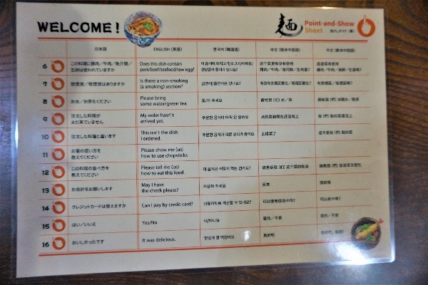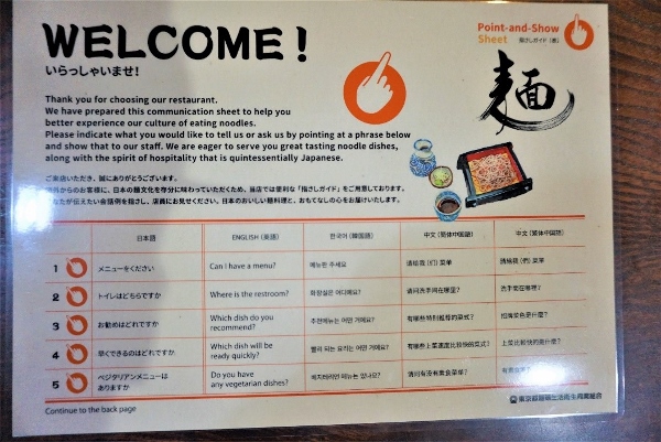 The Fukino family welcome foreign customers and make ready use of “Point-And-Show” laminated sheets prepared by the Tokyo Metropolitan Noodle Life and Hygiene Association. These provide useful translations in four languages of basic questions, as well as brief explanations of common hot and cold noodle dishes.