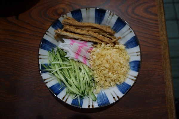 If you happen to be in the vicinity of Toyocho Metro station on a hot humid day, and are looking for something refreshing, but typically Japanese to eat, then look no further than the hiyashi (“chilled”) soba (buckwheat noodles) and udon (noodles made from wheat flour) on offer at Narashino-an.