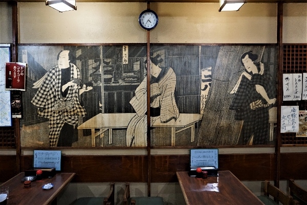 A huge wall covering running down one wall, based on an ukiyo-e (Japanese woodblock print) portraying an Edo-era (1603-1868) soba shop, catches your eye as you enter. Slatted wooden partitions separate the tables, and low-backed seats and cool-tiled flooring go to give the restaurant a traditional feel.