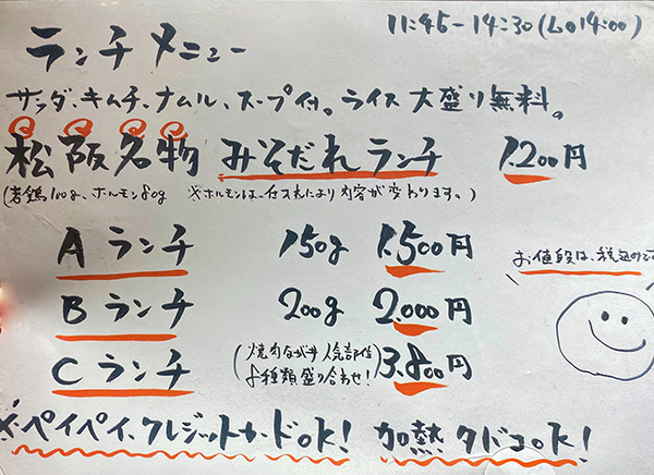 A Lunch (1,500 yen) features 150g of Wagyu beef plus all the side dishes