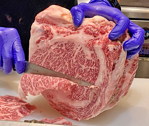 Mr. Nagai took his very sharp knife and with a few delicate strokes cut the meat into slivers, rather than slices. “The fatty part is sweet, while the red meat has a rich, savoury flavour,” he explained, indicating how different parts of the animal are cut in different ways to maximise the flavour when grilled. The meat is cut diagonally, the key to enhancing the flavour to the maximum.