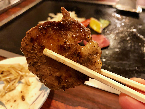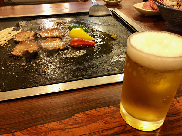 Ms. Masaki fires up the hot plate, before adding a touch of oil and a dab of butter. We start off with some beef tongue, thick cut and juicy. Kampai!