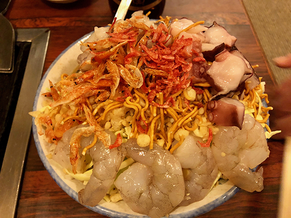 Monjayaki is a flour-based food with the essential ingredients varying little. Soft flour (hakurikiko in Japanese), low in protein and commonly used for cakes and biscuits, is mixed with a broth (dashi) to form a runny batter. Toppings are cooked on the hot plate before the batter is added and the whole thing is then cooked together. This is the best seller at Dondo, the mixed seafood monja, containing a veritable smorgasbord of marine delights: big fat shrimp, squid, octopus and small dried shrimp, plus cabbage, tempura nubbins and the crunchy snack noodle Baby Star.