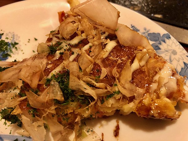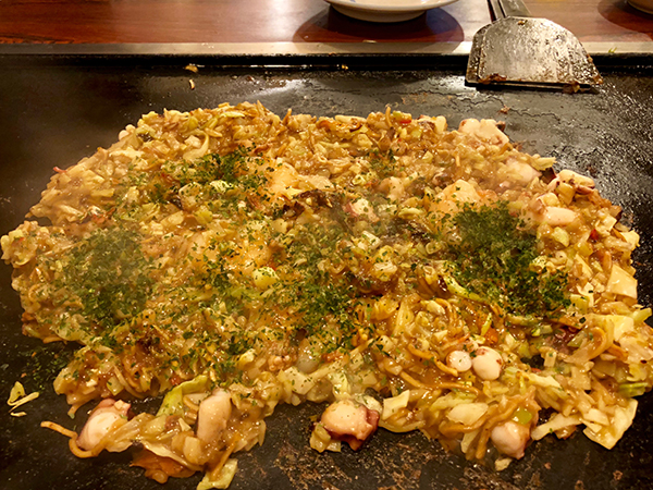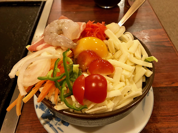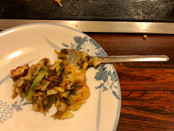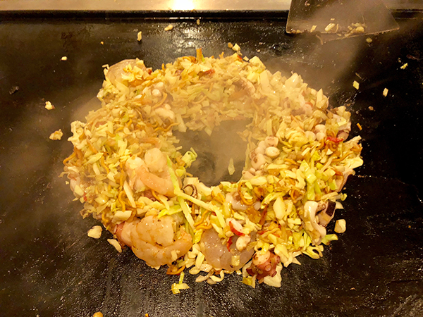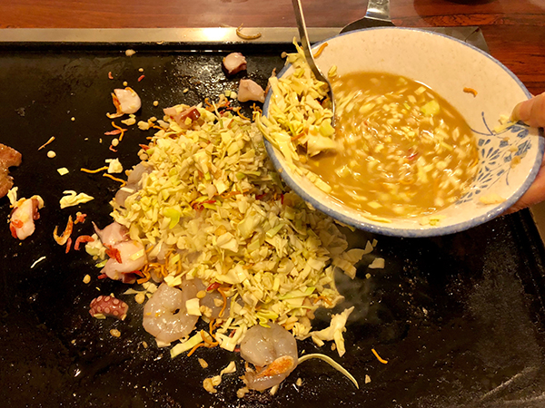 The broth is a key factor and remains a closely-guarded secret for many monja makers. Aside from the ingredients, successful monja construction is down to the dexterity and timing of the cook. First, the toppings are quickly cooked on the griddle, with most of the liquid left in the bowl.