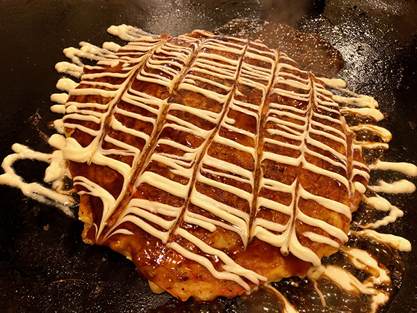 Okonomiyaki is cooked in oil only. She browns it on both sides, then brushes the top with okonomiyaki sauce and mayonnaise before cutting it into slices.
