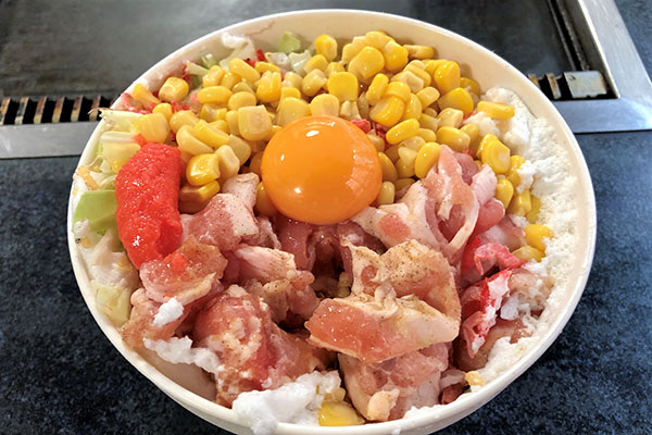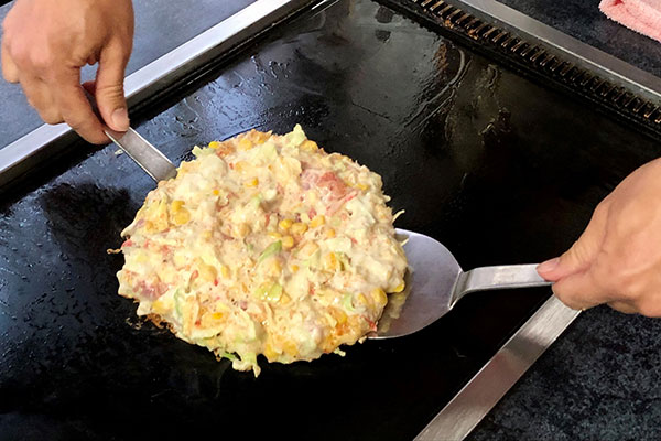 The mix contains pork, pollack roe (mentaiko), cabbage, corn, shredded squid, small shrimp, and yam. “We don’t use a lot of flour, substituting the yam instead for our customers’ health,” explained Mrs. Nakabayashi. “I also don’t use the central core of the cabbage, and don’t chop the leaves too finely, so it retains some crispiness in the finished pancake. Before we opened the restaurant we tried endless variations and so many recipes before finally deciding on this one.”