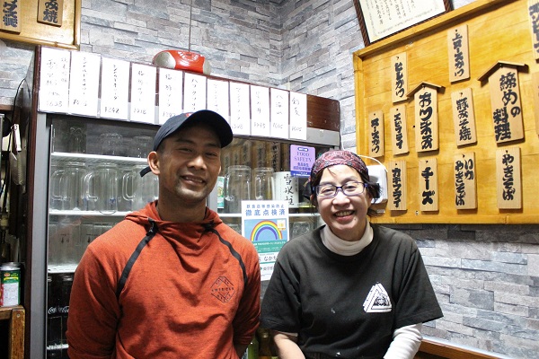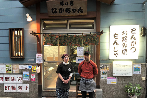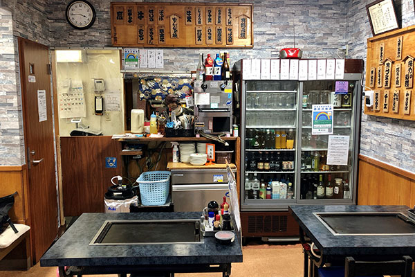 Nakachan has a cheery ambience created by Mrs. Nakabayashi and her son, who constantly banter in a friendly manner and clearly get on well. We were surprised to see tonkatsu (deep-fried pork cutlets) on the facade sign board, actually ahead of okonomiyaki and monja, while the interior menus featured offal (horumon) and skirt steak (harami), items more commonly found at horumon and barbecued beef restaurants respectively.