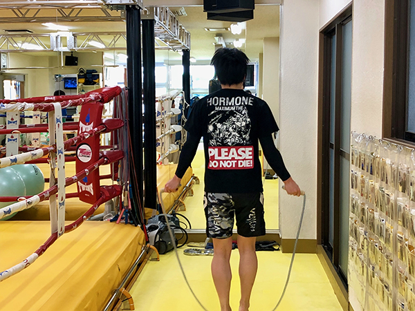What kind of form does the training take? “The students start off with some skipping to warm up, followed by high knee exercises. Then they practice boxing and finish off with kick training.” A young woman who fights as an amateur starts to warm up and kindly allows us to photograph her. She begins with the skipping and some stretching.