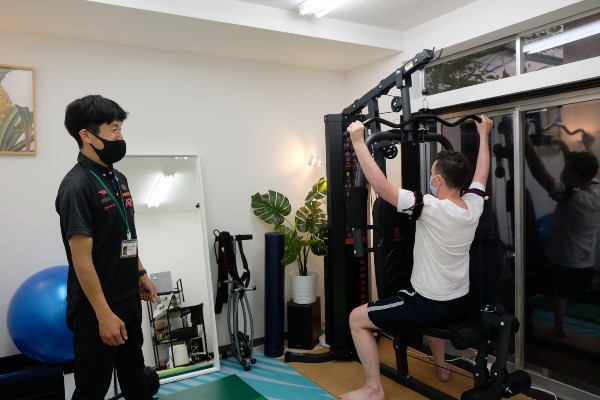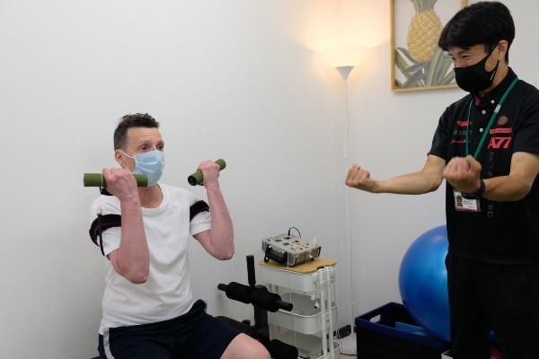 So, how does the kaatsu training work? “When customers first come, they sit on the bench and we discuss their targets and what exactly they want to achieve. This includes not only their training programme but also other aspects such as diet and lifestyle. The kaatsu training itself works by restricting the blood flow around the body with pneumatic bands, then performing a series of low-intensity exercises,” Mr. Kodama explained.