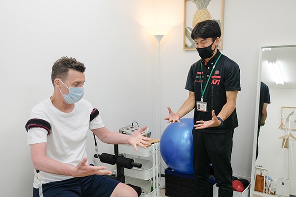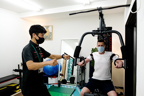 Mr. Kodama employs various techniques to relax stiff muscles or ease back pain, in order to improve training performance.