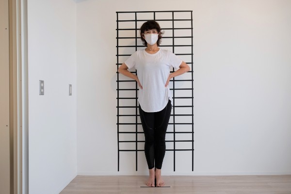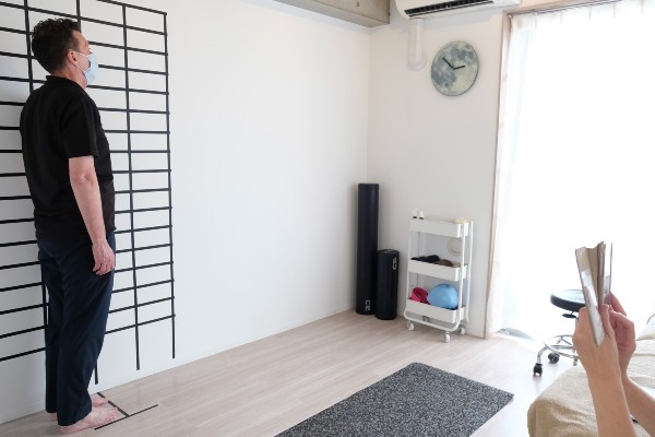 Ms. Yoshida takes photos (front and back, left and right profiles) against the taped wall, to both identify problems and to mark future progress. A few simple movements later she identifies several problems (muscle tension, misaligned spine, one shoulder higher than the other) and immediately begins a series of exercises to improve them.