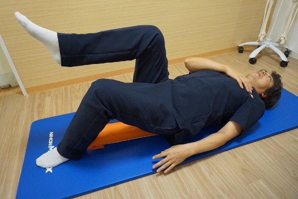 Finally, Mr. Nakamura closed the session by introducing me to Core Noodle, which involves neither hari nor o-kyuu. This long orange tube contains sponge cylinders, and is useful for exercising back muscles which need loosening and strengthening, but without requiring hard physical effort.