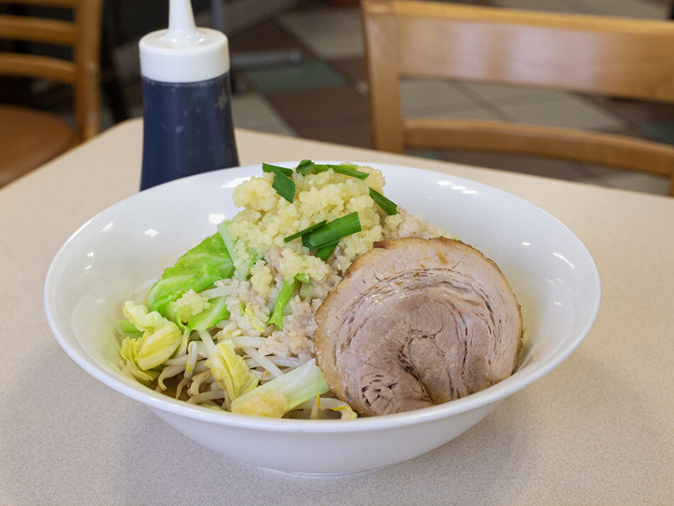 The “Butakichii Ramen” (Mazesoba) is a dish where vegetables are piled up generously on top of the noodles, and it is further topped with garlic, seasoned pork fat, and chopped green onions. The garlic, seasoned pork fat, and chopped green onions are served in their usual amounts as shown in the photo, but you can also request for extra servings when placing your order. This restaurant also offers a variety of menu options, including mini-sized portions that are easy for women to enjoy.