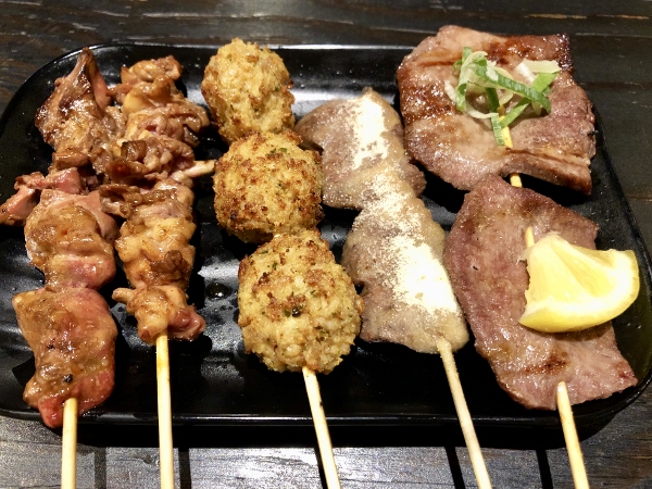 The yakitori is immensely popular. With around 22 items on the menu, prices range from 100 yen for negi onion to 300 yen for beef tongue. According to Mr. Tanabe, the rather unusual chicken giblets yakitori is very popular, as is the liver. So popular is the liver that some customers will order 10 skewers, then immediately order ten more! From left to right: liver, giblets, tsukune minced meat balls, heart with garlic powder, and beef tongue. Very nice with a cold beer! A selection of 10 skewers costs 1380 yen plus tax.