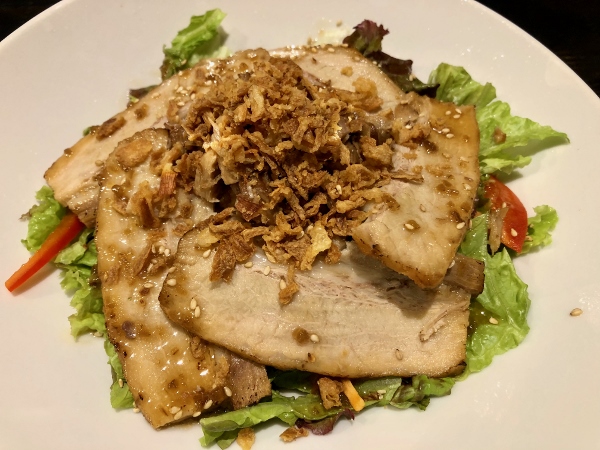 Besides yakitori the evening menu contains a range of deep-fried items such as shrimp, chicken gyoza, octopus balls, horse mackerel, chorizo, croquettes, potato fries and fried chicken. The fried chicken is another top seller, due to its “secret sauce”. Salads are very attractive, with the most in-demand featuring the home made chashu pork belly, which is steeped in the same sauce as is used for the yakitori. At 780 yen plus tax, it’s very tempting.