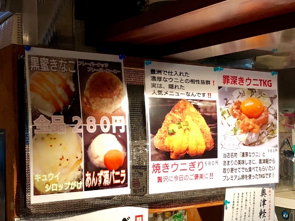 For hardcore sea urchin fans, there’s the “unigiri”, a combination of baked rice ball (onigiri) with sea urchin (uni) for 680 yen. Mr. Tanabe particularly recommended the chicken gyoza explaining, “It’s garlic free so there’s no worry about any after odour unlike regular pork gyoza. The chicken meat we use is really good quality, very juicy. The gyoza are cooked in the juices from the chicken meat so they are very succulent.”