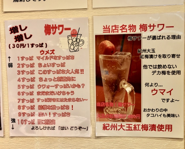 The drink menu contains all the usual favourites, with Premium Malts as the main draft beer. Maker’s Mark, Jim Beam and Kaku whiskey are the featured highballs as the boom continues apace. The most ordered sours are those containing enormous pickled plums from the Shinshu region of central Japan, which roughly corresponds to modern day Nagano Prefecture. Customers can increase the sourness level from one to ten with each level costing an additional 30 yen.