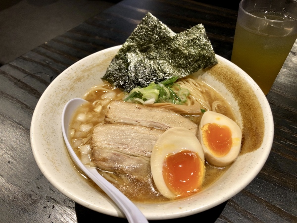 Mr. Tanabe disappears behind the counter where he whips up a steaming bowl of noodles with the deft, efficient movements of an experienced practitioner. “We create our soup from dried baby sardines (niboshi) sourced from a Kyoto-based manufacturer of 100 years standing. Dried mackerel and dried urume-iwashi sardines are also added to a base broth made from chicken.” The soup is very robust, a savoury fishy delight that is both light but deeply-flavoured. Served with two thick slices of homemade chashu pork belly and a half-boiled egg, it’s the top seller at a very reasonable 780 yen.