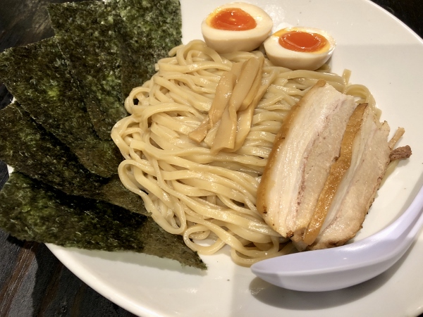 Using the same niboshi soup base, Menya Barao offers a series of variations on a theme: an extra-rich chicken soup ramen at 830 yen, a chili-infused spicy miso ramen at 800 yen, a popular, soupless mazé-soba at 800 yen and the beauty pictured here, a dipping soba (tsukemen) at 850 yen. All prices are including tax.