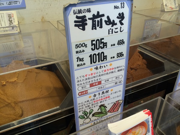 Shopping for miso at Sano Miso is easy. The boards located next to each display case show the price, give a brief description of the flavour, sweetness level and strength, as well as a pictorial guide to the ingredients that go best with each miso. The salt content is also clearly shown.