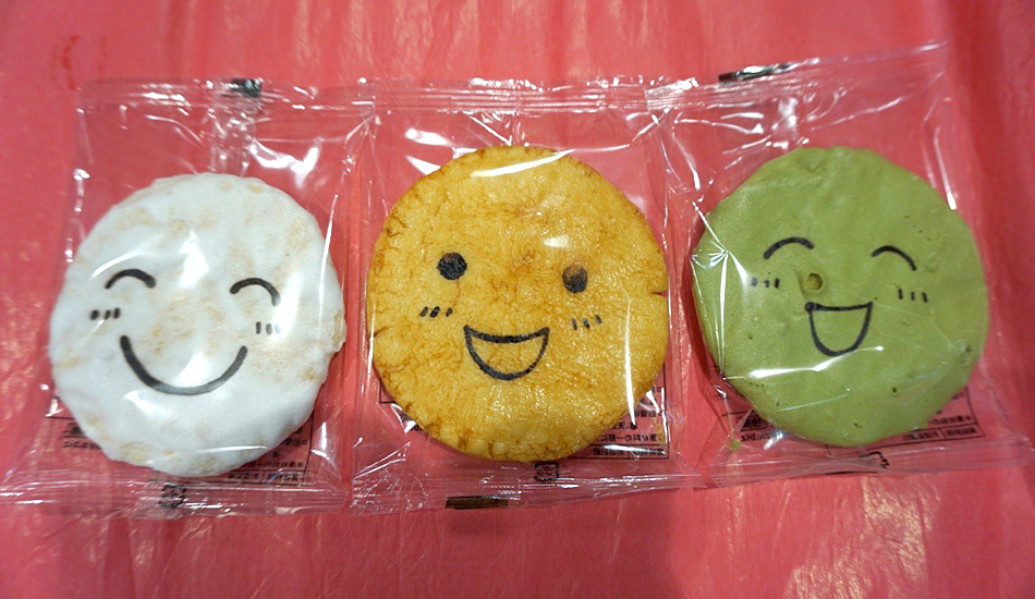 Whilst senbei, mame and okashi are considered to be traditional fare, Mr. Aoki has combined this image with humorous innovative offerings, such as Minatoya’s “face” (see top photograph) and “arigatou” (thank you) senbei. These cheerful crackers come in 3 flavours: soy, green tea and sugar-coated and make a charming but inexpensive “message with a difference”.