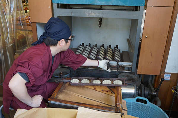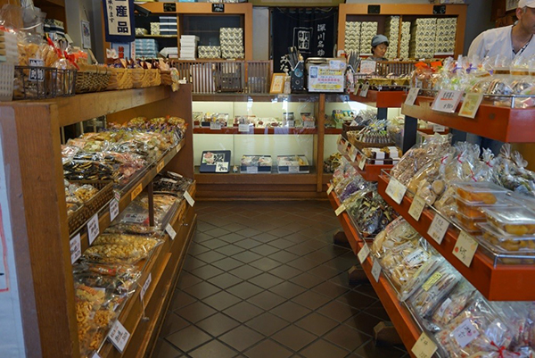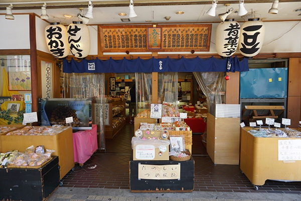 This family-run shop sells roughly 100 types and sizes of senbei, 30-odd types of “mame” (beans) and numerous “okashi” (traditional-style sweets). According to Mr. Aoki, the okashi add colour and a bit more of a selection to the already-wide range of senbei and mame on offer.