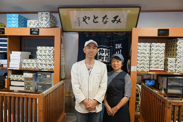 Strategically placed on a corner of Monzen-nakacho’s covered shopping arcade, a short distance from Fukagawa Fudoson temple and Tomioka Hachimangu shrine, Minatoya has been in business since 1948. The current owner, Mr. Takashi Aoki (pictured here with his mother) is the 3rd generation owner of the business started by his grandfather.