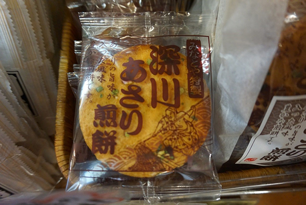 When I asked him what sells best, Mr. Aoki said without hesitation, “For the Japanese customers wandering around the Fukagawa area to visit the famous temple and shrine it is the Fukagawa Asari”. These senbei are flavoured with clams which form part of a famous local dish. And you can see the fisherman trawling for clams on the wrapping of the senbei