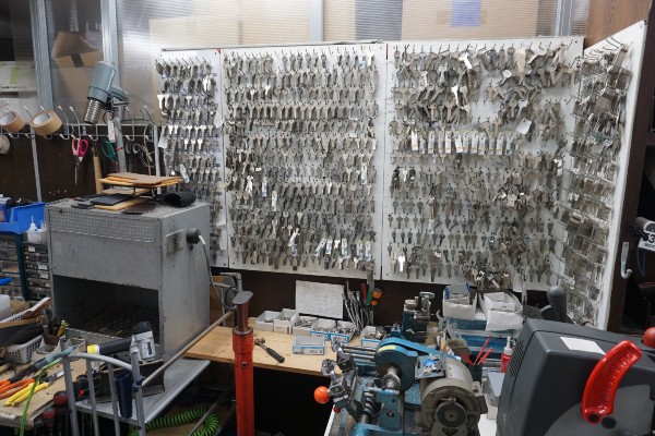 Whilst we were chatting, a couple of customers called in at the counter to see if they could have copy keys made. As well as key catalogues to which he refers, the back wall of the shop is covered with a vast array of blank keys to choose from.