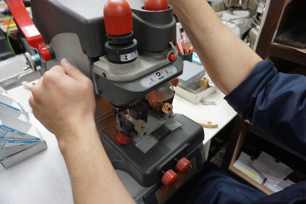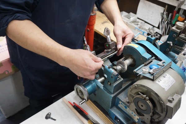 Mr. Sugimoto relies on two types of key-cutting machines to produce copies: for keys with simple outlines he uses a manual grinder to cut and sand the copy key in all of 3 minutes, with prices starting at 660 yen, including tax.