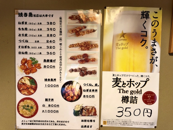 The menu at Chikurin is extensive, containing many dishes which feature tuna and seafood. Such traditional Showa-era classics as curry rice, grilled mackerel, grilled eel, and pork and ginger are also available. There’s yakitori too, the grilled bamboo skewers of chicken loved by all ages, six varieties priced from 240~390 yen for sets of two. Deep-fried chicken costs 800 yen, while a hearty bowl of yakitori chicken on rice is 1,000 yen. All the usual drinks are available, with Sapporo Gold as draft beer at 350 yen a mug.