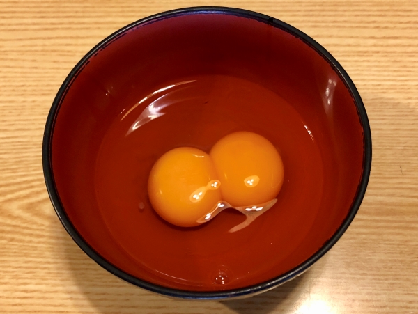 The branded eggs used by Mrs. Nakamura, from Kakegawa in Shizuoka Prefecture, have double yolks. Each egg roll is made with 5 eggs. Customers can also buy the eggs, which cost 350 yen for a carton of ten.