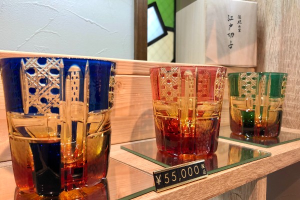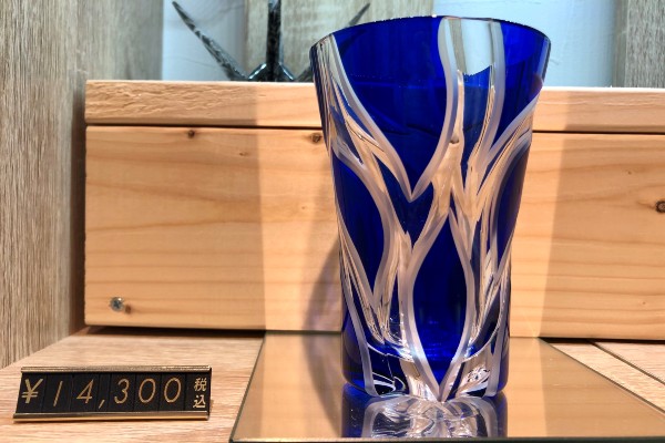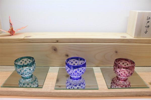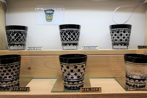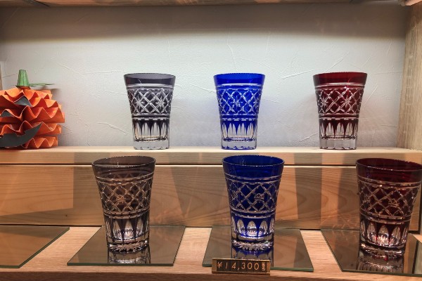 While some pieces such as the blue tumbler above are original designs, Edo Kiriko has a number of traditional motifs to match the glass cutting technique. These tumblers feature the palisade design (yarai) and start at 14,300 yen apiece.